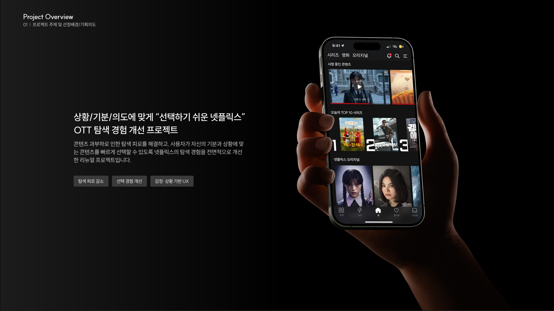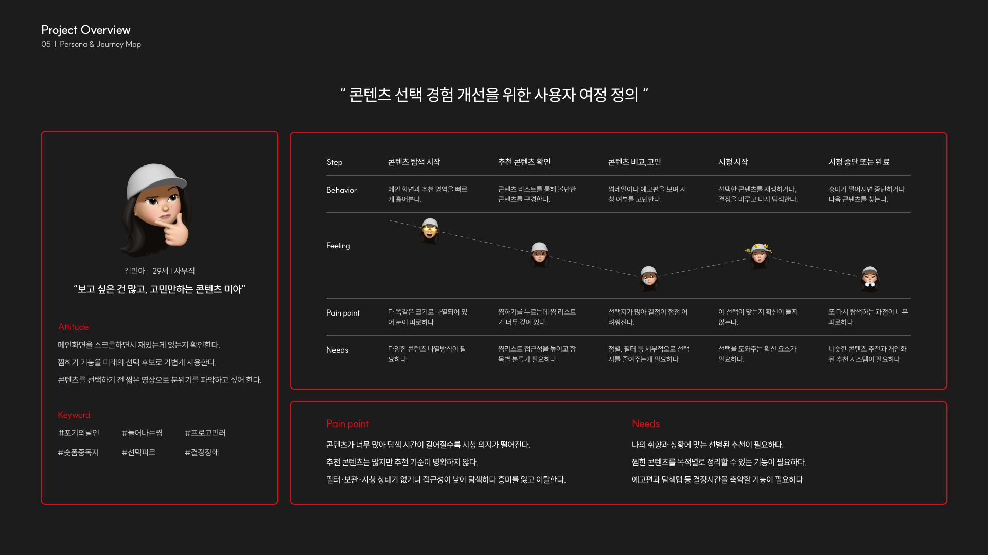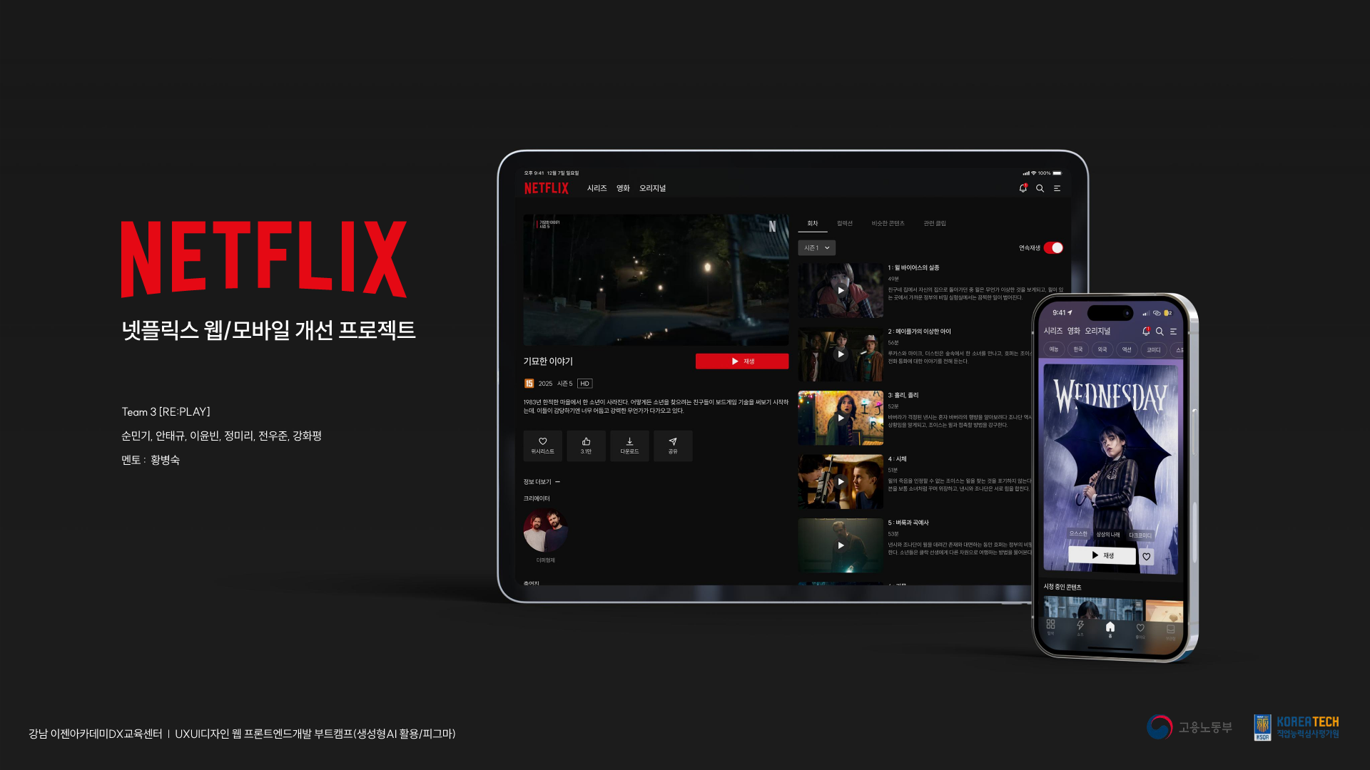 예를 들어, 한 팀은 OTT 서비스의 콘텐츠 탐색 경험 개선을 주제로 프로젝트를 진행했습니다. 콘텐츠 과부하로 인한 선택 피로 문제를 UX 관점에서 분석하고, 기분·상황 기반 탐색, 필터·정렬 구조 강화, 쇼츠형 예고편 UI 등 다양한 기능을 설계·구현했습니다. 해당 프로젝트는 React 기반 프론트엔드 구조와 협업 개발 환경을 적용해 실제 서비스와 유사한 수준으로 완성되었습니다.