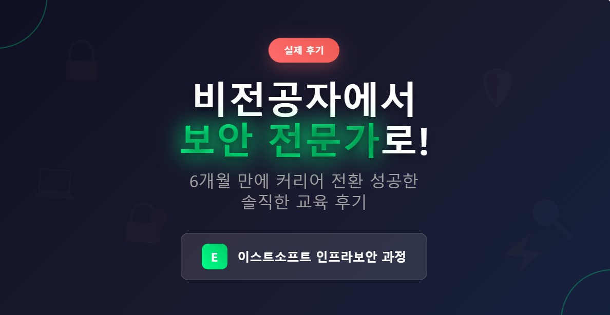 "전공 없어도 괜찮다! 실무 중심 교육으로 보안 커리어 성공기" "6개월 만에 보안 전문가가 된 비전공자의 솔직한 후기" "막막했던 진로에서 보안 전문가까지, 나의 커리어 전환 스토리"
